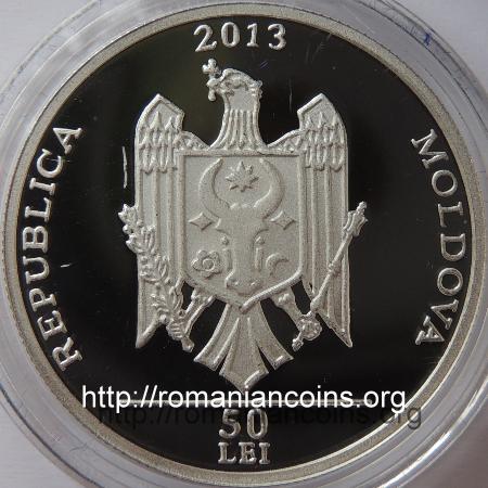 28 mm diametru, 13 g, 99.9% argint, margine cu zimți anul 2013, REPUBLICA MOLDOVA, stema Republicii Moldova, în exergă linie orizontală și valoarea nominală 50 LEI |