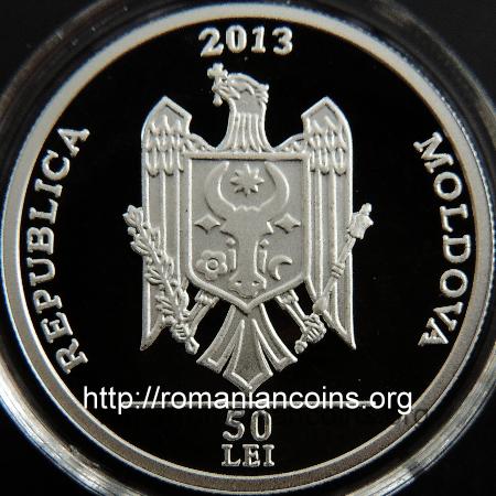 30 mm diametru, 16.5 g, 99.9% argint, margine cu zimți anul 2013, REPUBLICA MOLDOVA, stema Republicii Moldova, în exergă linie orizontală și valoarea nominală 50 LEI |