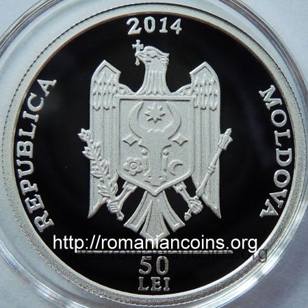 30 mm diametru, 16.5 g, 99.9% argint, margine cu zimți anul 2014, REPUBLICA MOLDOVA, stema Republicii Moldova, în exergă linie orizontală și valoarea nominală 50 LEI |