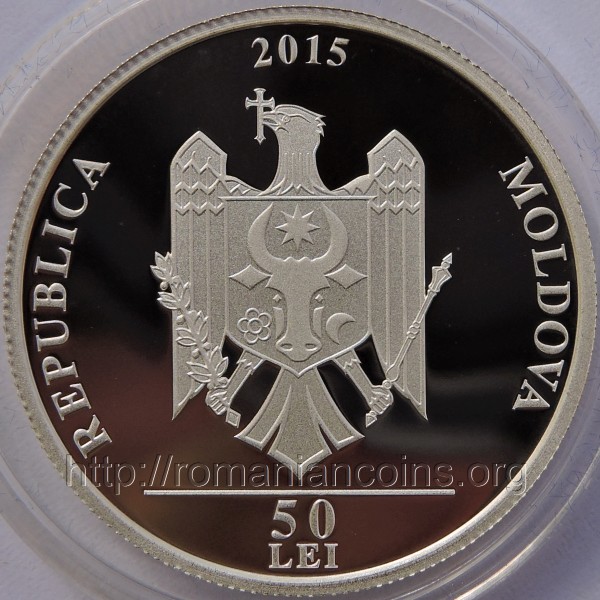 | 28 mm diametru, 13 g, 99.9% argint, margine cu zimți anul 2015, REPUBLICA MOLDOVA, stema Republicii Moldova, în exergă linie orizontală și valoarea nominală 50 LEI |