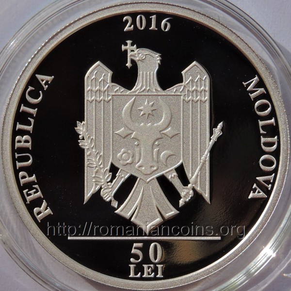 30 mm diametru, 16.5 g, 99.9% argint, margine cu zimți anul 2016, REPUBLICA MOLDOVA, stema Republicii Moldova, în exergă linie orizontală și valoarea nominală 50 LEI |