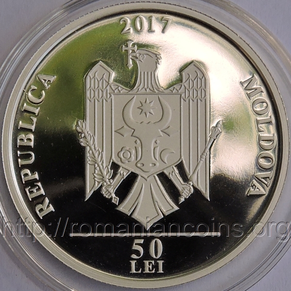30 mm diametru, 16.5 g, 99.9% argint, margine cu zimți anul 2017, REPUBLICA MOLDOVA, stema Republicii Moldova, în exergă linie orizontală și valoarea nominală 50 LEI |