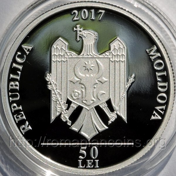 28 mm diametru, 13 g, 99.9% argint, margine cu zimți anul 2017, REPUBLICA MOLDOVA, stema Republicii Moldova, în exergă linie orizontală și valoarea nominală 50 LEI |