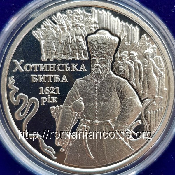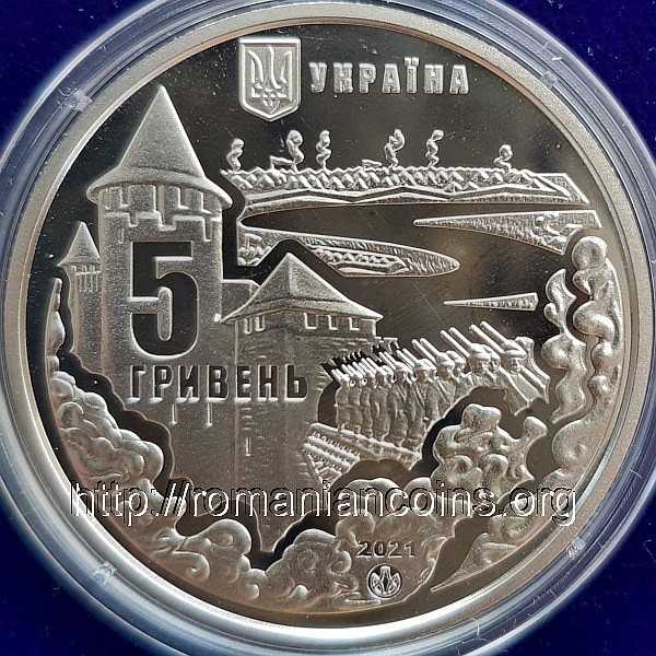 35 mm diametru, 16.54 g, alpaca, margine cu zimți Avers: stema mică a Ucrainei, inscripția УКРАЇНА însemnînd UCRAINA, la stînga Cetatea Hotinului, peste cetate valoarea nominală 5 GRIVENI (cu litere chirilice) însemnînd 5 GRIVNE, o trupă de pușcași ieșind din cetate; în prim-plan nori de fum, anul 2021 și logo-ul Băncii Naționale a Ucrainei; în dreapta rîul Nistru, în plan îndepărtat fiind tabăra de corturi a armatei turcești |
