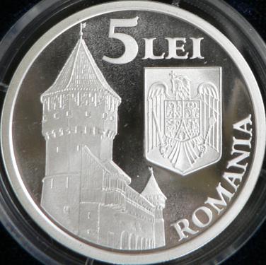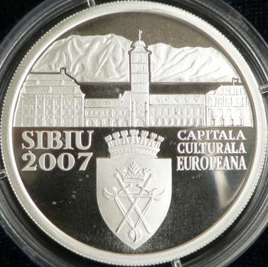 37 mm diametru, 31.103 g, argint 99.9%, margine cu zimți Avers: valoarea nominală 5 LEI, stema României, ROMANIA, zidul de apărare al cetății Sibiu, cu Turnul Dulgherilor în prim-plan și cu Turnul Olarilor în plan secund | Revers: clădiri reprezentative din Sibiu (de la stînga la dreapta): Muzeul Brukenthal, Turnul Sfatului (împreună cu clădirea vecină, cea din stînga), Casa Artelor și Casa Luxemburg, în spate Munții Făgăraș, jos stema municipiului Sibiu, inscripțiile SIBIU 2007 și CAPITALA CULTURALA EUROPEANA