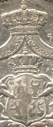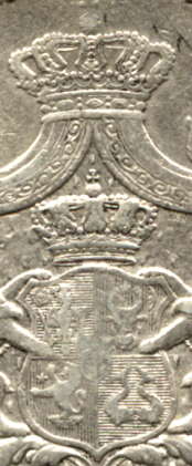 Axa verticală a scutului este dreaptă. | Axa verticală a scutului este înclinată (din dreapta sus spre stînga jos). În plus, coroana superioară este mai mare și are o altă ornamentație. |