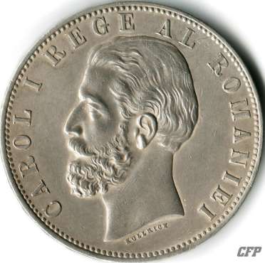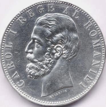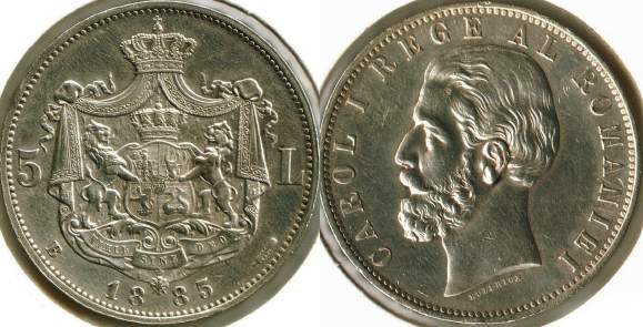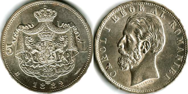 37 mm diametru, 25 g, argint 90%, cupru 10% În relief pe muchie deviza: PATRIA SI DREPTUL MEU valoarea nominală 5 L, anul 1883, stema României, litera B și spic de grîu, cerc perlat exterior | inscripția CAROL I REGE AL ROMANIEI și efigia regelui spre stînga, cerc perlat exterior. Sub gît este scris numele gravorului, KULLRICH. Tiraj: 1.230.000 monede cu anul 1881 1.100.000 monede cu anul 1882 2.300.000 monede cu anul 1883 300.000 monede cu anul 1884 40.000 monede cu anul 1885 |