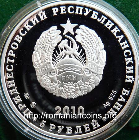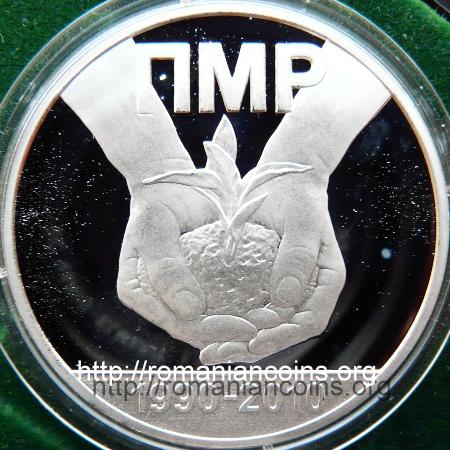 39 mm diametru, 33.8 g, argint 92.5%, margine netedă Avers: valoarea nominală 5 RUBLEI, stema autoproclamatei republici transnistrene (cu secera și ciocanul), inscripția · PRIDNESTROVSKII RESPUBLIKANSKII BANK · (cu litere chirilice) însemnînd BANCA REPUBLICANĂ [TRANS] NISTREANĂ, anul 2010, la stînga semne de monetărie (MMD și cap de rusoaică), la dreapta Ag925 reprezentînd titlul argintului | Revers: mîini plantînd o mlădiță, prescurtarea în limba rusă PMR, în exergă anii 1990-2010 Tiraj: 250 exemplare |