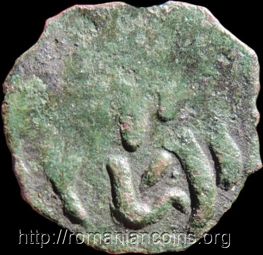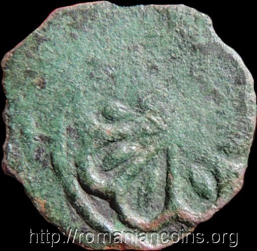 diametru 17 mm, neregulat, 0.66 g, AE Averstamga aparţinînd casei lui Nogai şi inscripţie cu litere arabe | Revers în cerc liniar exterior o rozetă cu opt petale |