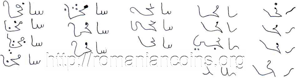 În ceea ce priveşte monedele atelierului monetar de la Isaccea, este instructiv de analizat inscriţiile de pe monedele de argint ce îi sînt atribuite. Pe site-ul ZENO.RU [8] există zeci de piese de argint bine bătute şi bine păstrate, cu imagini de asemenea de bună calitate. Pe cele cîteva tipuri de piese de argint - ce par foarte coerente ca stil şi ca aspect general - numele atelierului are o mare diversitate de forme de scriere. Litera s iniţială poate avea mai puţine bucle decît normal, sau poate să fie redusă la o liniuţă oblică sau curbă. A treia literă, presupusă a fi kaf (q), poate fi redusă la un fel de virgulă, sau poate chiar să dispară. Situaţia este complicată şi de faptul că semnele diacritice lipsesc parţial sau total, sau sînt plasate nu la locul lor, ci în spaţiul rămas disponibil pe monedă. În plus, literele trei şi patru formează o ligatură.