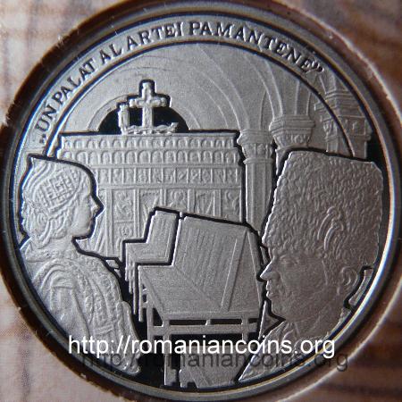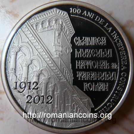 28 mm diametru, 15.5 g, 80% argint, margine netedă Avers: o porțiune din fațada clădirii muzeului, anii 1912 și 2012, în cîmp inscripția CLADIREA MUZEULUI NATIONAL AL TARANULUI ROMAN, în dreapta inscripția circulară 100 DE ANI DE LA INCEPEREA CONSTRUCTIEI | Revers: o parte dintr-o sală de expoziție a muzeului, în prim plan două manechine îmbrăcate în costume populare românești, sus inscripția UN PALAT AL ARTEI PAMANTENE” (așa a caracterizat muzeul primul său director, Alexandru Tzigara-Samurcaș)