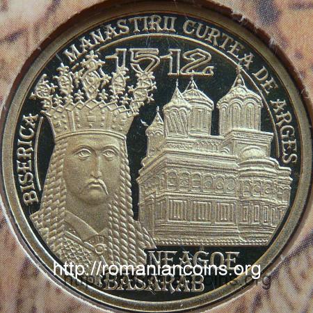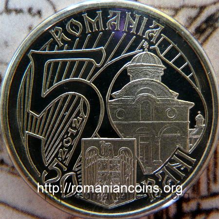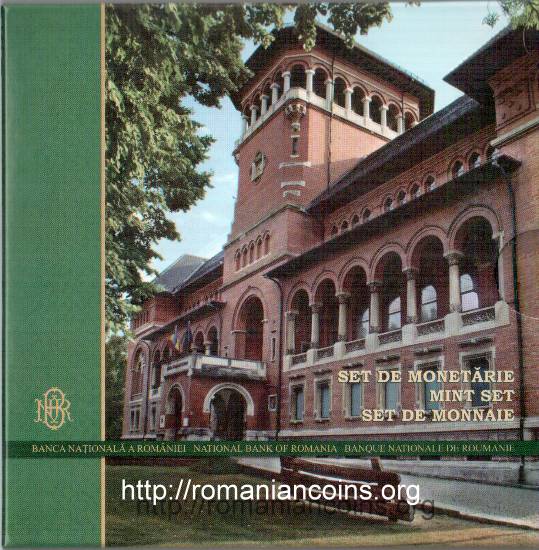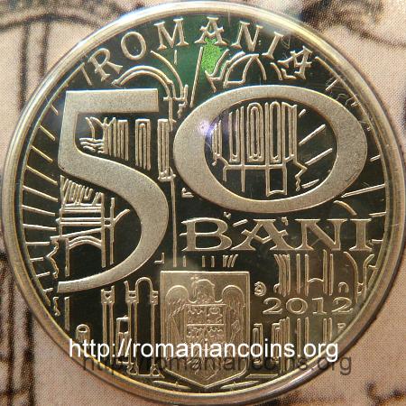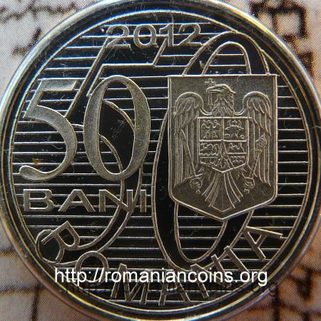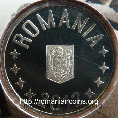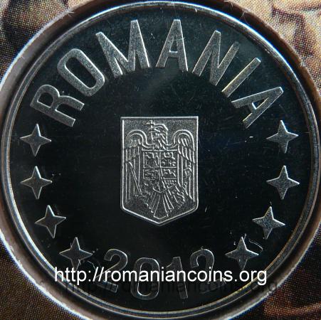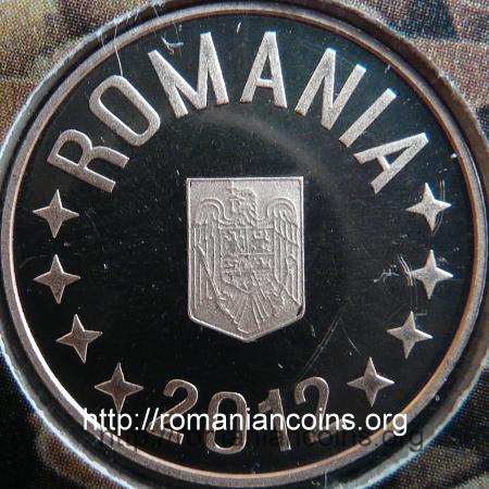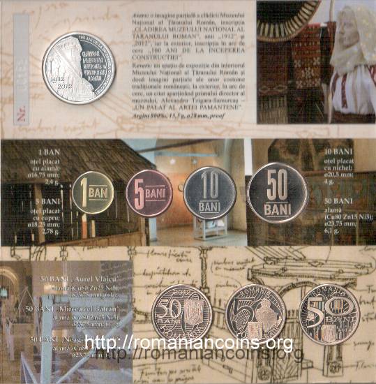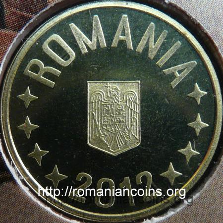 Setul din 2012 cuprinde noile monede de 1 ban, 5, 10 și 50 de bani intrate în circulație la 1 iulie 2005. Toate monedele sînt de calitate proof (sau poate like-proof - pe cartonul setului se precizează că medalia are calitatea proof, dar despre monede nu se spune de fapt nimic). Mai conține moneda omagială de 50 de bani dedicată lui Aurel Vlaicu și avionului său, varianta proof cu fețele amplasate medalistic, cu anul 2012. Moneda a fost emisă inițial în anul 2010 pentru a aniversa 100 de ani de la primul zbor al lui Aurel Vlaicu. Există trei variante de 50 bani Vlaicu 2010: una de circulație, de calitate obișnuită, una proof cu fețele amplasate medalistic (în componența setului de monetărie 2010) și una proof cu orientarea fețelor de tip monedă. Ca urmare, 50 bani Vlaicu 2012 este o apariție oarecum ciudată, fiindcă ar rezulta că aniversează 102 ani de la primul zbor! Setul conține o monedă de 50 de bani Mircea cel Bătrîn, cu fețele plasate medalistic, realizată la calitate proof. Piesa de 50 bani 2011 Mircea cel Bătrîn a fost bătută pentru a aniversa 625 de ani de la urcarea pe tron a voievodului muntean. Piesa există în varianta de circulație, de calitate obișnuită. Ar rezulta că moneda din 2012 aniversează 626 de ani de la eveniment! Setul conține și o monedă de 50 de bani Neagoe Basarab, cu fețele plasate medalistic, realizată la calitate proof. Piesa de 50 bani 2012 Neagoe Basarab există în varianta de circulație, de calitate obișnuită. |