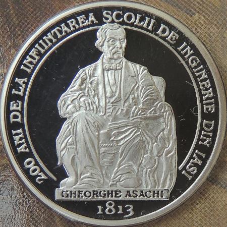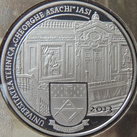 28 mm diametru, 15.5 g, 80% argint, margine netedă Avers: în cerc liniar interior statuia lui Gheorghe Asachi din Iași, pe soclu GHEORGHE ASACHI, inscripția circulară 200 ANI DE LA INFIINTAREA SCOLII DE INGINERIE DIN IASI, în exergă anul 1813 | Revers: o imagine cu aula Universității Tehnice Gheorghe Asachi din Iași, stema Universității Tehnice, anul 2013, inscripția în arc de cerc UNIVERSITATEA TEHNICA GHEORGHE ASACHI IASI