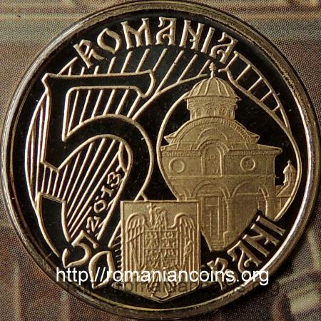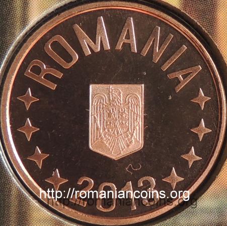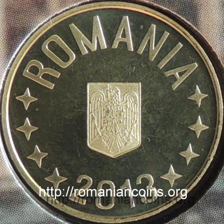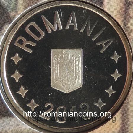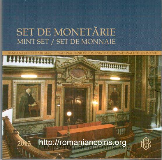 Setul din 2013 cuprinde noile monede de 1 ban, 5, 10 și 50 de bani intrate în circulație la 1 iulie 2005. Toate monedele sînt de calitate proof (sau poate like-proof - pe cartonul setului se precizează că medalia are calitatea proof, dar despre monede nu se spune de fapt nimic). Mai conține moneda omagială de 50 de bani dedicată lui Aurel Vlaicu și avionului său, varianta proof cu fețele amplasate medalistic, cu anul 2013. Moneda a fost emisă inițial în anul 2010 pentru a aniversa 100 de ani de la primul zbor al lui Aurel Vlaicu. Există trei variante de 50 bani Vlaicu 2010: una de circulație, de calitate obișnuită, una proof cu fețele amplasate medalistic (în componența setului de monetărie 2010) și una proof cu orientarea fețelor de tip monedă. Ca urmare, piesele de 50 bani Vlaicu din 2011, 2012 și 2013 ce intră în componența seturilor de monetărie din anii respectivi sînt apariții oarecum ciudate, fiindcă ar rezulta că aniversează 101, 102 și 103 ani de la primul zbor! Setul conține o monedă de 50 de bani Mircea cel Bătrîn, cu fețele plasate medalistic, realizată la calitate proof. Piesa de 50 bani 2011 Mircea cel Bătrîn a fost bătută pentru a aniversa 625 de ani de la urcarea pe tron a voievodului muntean. Piesa există în varianta de circulație, de calitate obișnuită. Ar rezulta că monedele din 2012 și 2013 aniversează 626 și 627 de ani de la eveniment! Setul conține și o monedă de 50 de bani Neagoe Basarab, cu fețele plasate medalistic, realizată la calitate proof. Piesa de 50 bani 2012 Neagoe Basarab există în varianta de circulație, de calitate obișnuită. Ar rezulta că moneda din 2013 aniversează 501 ani de la eveniment! |