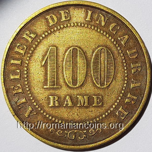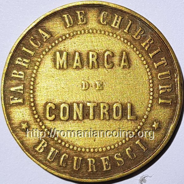 30 mm, alamă inscripția circulară ATELIER DE INCADRARE, jos ornament, în cerc perlat interior valoarea 100 RAME | inscripția circulară FABRICA DE CHIBRITURI * BUCURESCI *, în cerc perlat interior MARCA DE CONTROL |