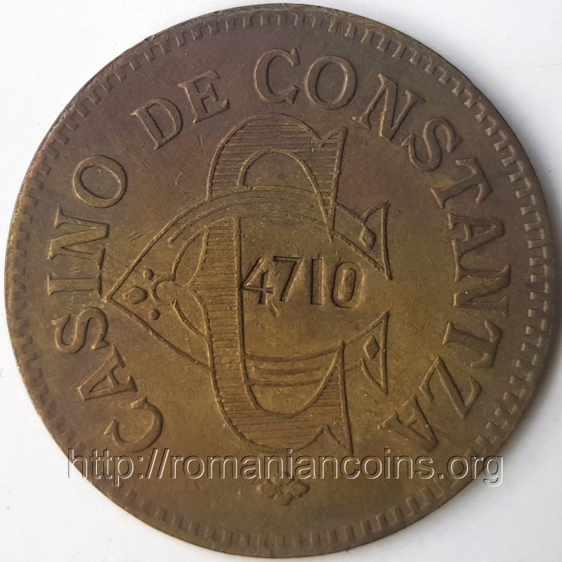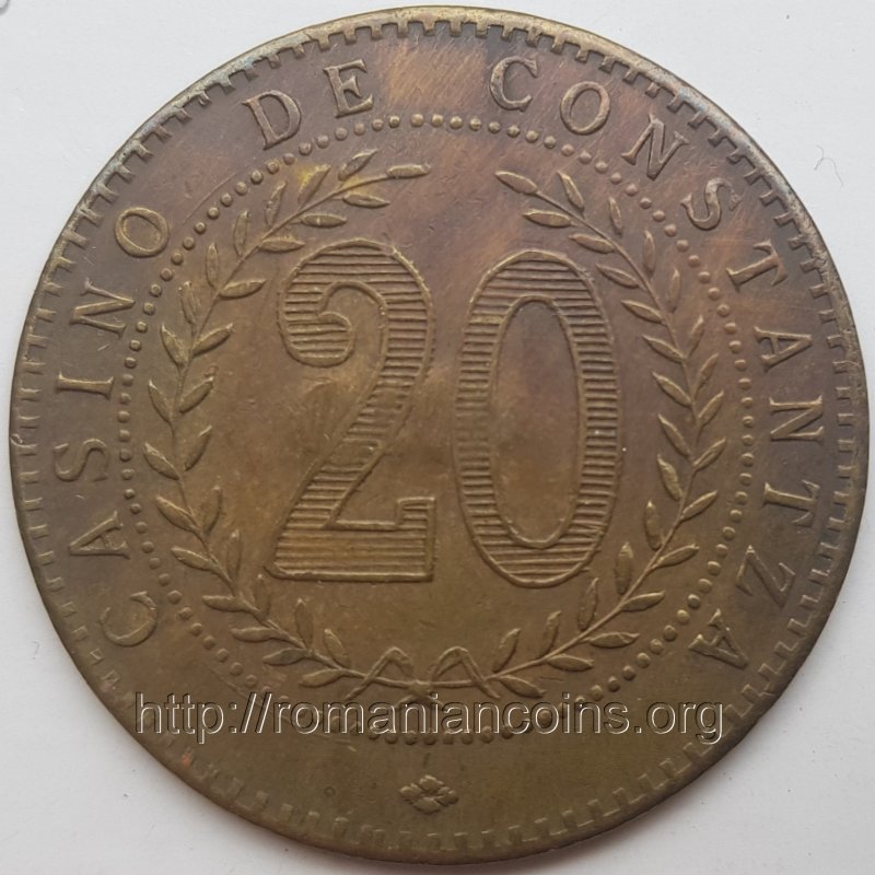 30.3 mm, ? g, alamă valoarea nominală 20 în cunună de ramuri de laur, cerc perlat exterior, inscripția CASINO DE CONSTANTZA; în exergă un mic ornament romboidal | inscripția CASINO DE CONSTANTZA, monograma CC, cerc perlat exterior; în interiorul monogramei numărul 4710, poansonat; în exergă un mic ornament romboidal |