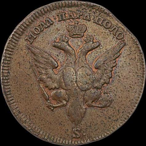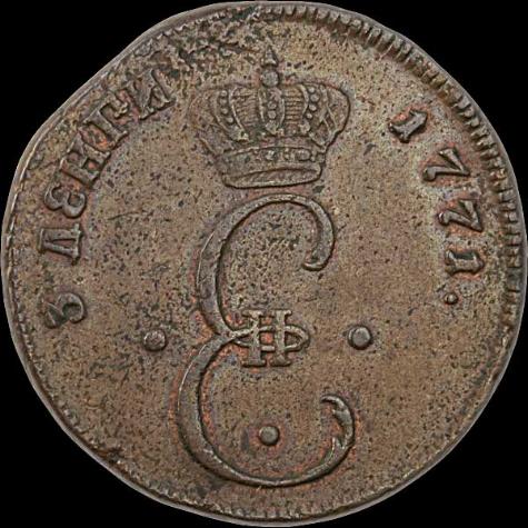 | cifrul E II (II fiind plasat peste brațul din mijloc al lui E) al împărătesei Ecaterina a II-a, încoronat cu o coroană imperială; în jurul lui E trei globule marcînd valoarea 3, inscripția cu litere chirilice 3 DENGHI 1771.; cerc zimțat exterior