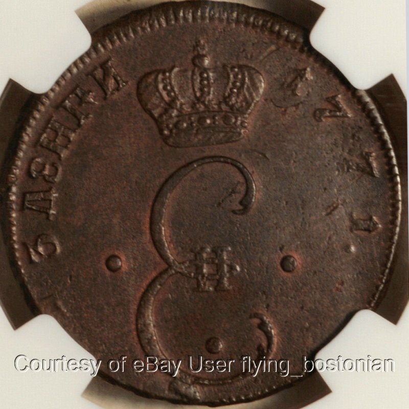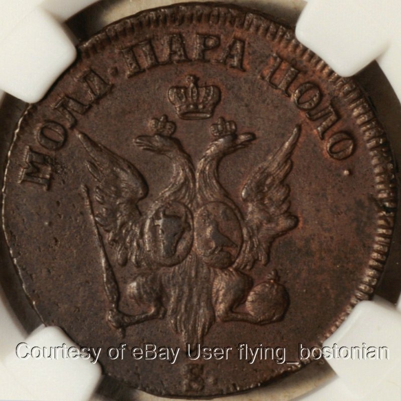 | cifrul E II (II fiind plasat peste brațul din mijloc al lui E) al împărătesei Ecaterina a II-a, încoronat cu o coroană imperială; în jurul lui E trei globule marcînd valoarea 3, inscripția cu litere chirilice 3 DENGHI 1771.; cerc zimțat exterior