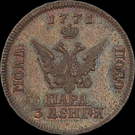 acvilă bicefală cu capetele încoronate și cu o coroană deasupra, cu aripile întinse, cu sceptru și glob cruciger în gheare, cu scuturi ovale cu stemele Moldovei și Valahiei pe piept; în exergă PARA, o linie orizontală și, cu litere chirilice, 3 DENGHI; în părți, tot cu litere chirilice, inscripția MOLD: 1771 POLO:; cerc zimțat exterior; muchia ornamentată (frunze de stejar)