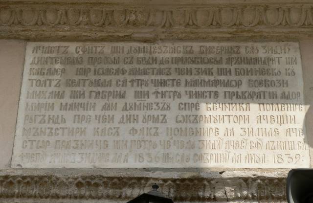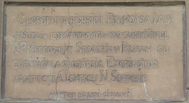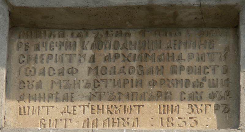 | pisania din 1833 de pe turnul clopotniță al Mănăstirii Frumoasa: La anul 1819 s-au început zidi- re aceștii clopodniți de mine smeritul arhimandritul Ioasaf Moldovan proisto- sul mănăstirii Frumoasa și din răle întîmplări s-au făr- șit de tencuit și zugră- vit la anul : 1833 : |