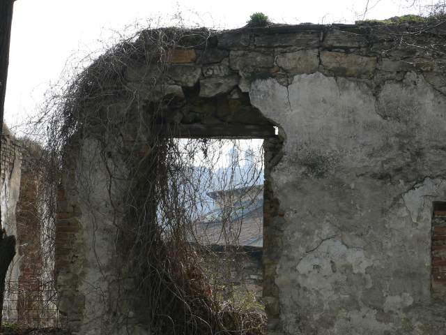 | ruinele palatului de la Frumoasa, construit în 1812 de arhitectul Martin Kubeica; pe fereastră se observă profilul Mănăstirii Cetățuia |