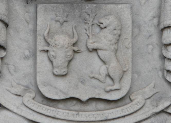 | detaliu cu stema de pe monument: se observă deviza UTROQUE CLARESCERE PULCHRUM, ce mai poate fi văzută și pe castelul de la Miclăușeni |