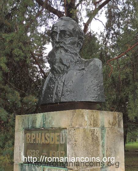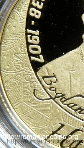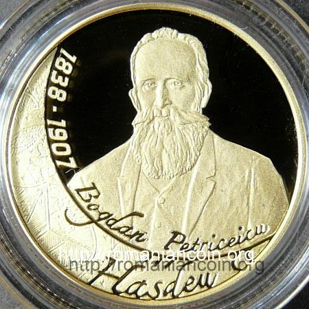 21 mm diametru, 6.452 g, 90% aur, margine cu zimți Avers: anul 2013, stema României, ROMANIA, valoarea nominală 100 Lei, o imagine a clădirii muzeului Bogdan Petriceicu Hasdeu din Cîmpina | Revers: bustul lui Hasdeu, inscripția 1838-1907 Bogdan Petriceicu Hasdeu, în stînga-jos, într-un spațiu în formă de semilună, un fragment din stema pe care Hasdeu o atribuia domnitorului Moldovei Ștefan Petriceicu