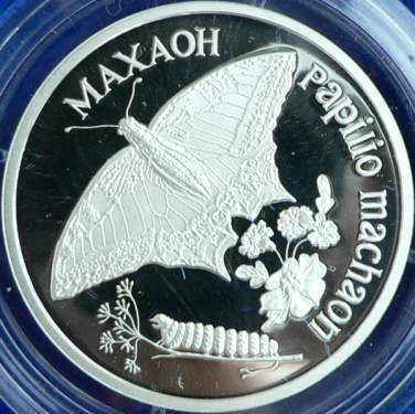 Avers: 32 mm diametru, 14.14 g, argint 92.5%, margine netedă valoarea nominală 100 RUBLEI, stema autoproclamatei republici transnistrene (cu secera și ciocanul), inscripția · PRIDNESTROVSKII RESPUBLIKANSKII BANK · (cu litere chirilice) însemnînd BANCA REPUBLICANĂ [TRANS] NISTREANĂ, anul 2006, dedesubt 925 reprezentînd titlul argintului | Revers: inscripția MAHAON (cu litere chirilice) și papilio machaon, fluturele și larva sa Tiraj: 1000 exemplare |