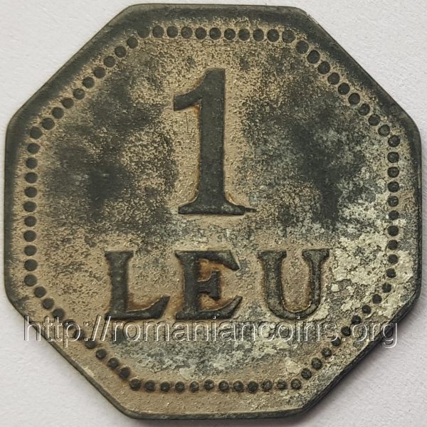 octagon, width 22 mm, silvered zinc, 2.75 g face value 1 LEU, outer pearl octagon | outer pearl octagon, in exergue the name of the engraver, M. CARNIOL, circular inscription CANTINA INTERNAȚIONALA • BUȘTENARI • meaning INTERNATIONAL CANTEEN, in the middle monogram CT |