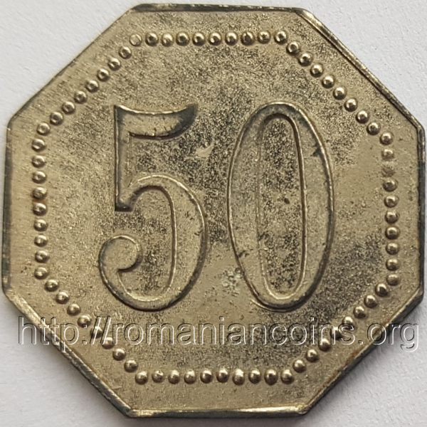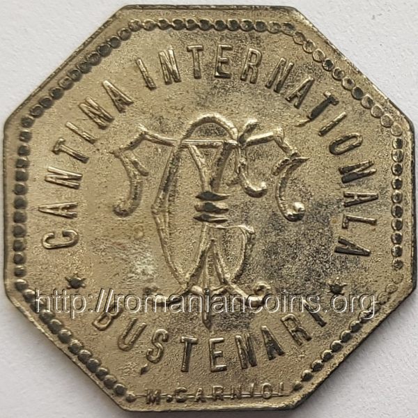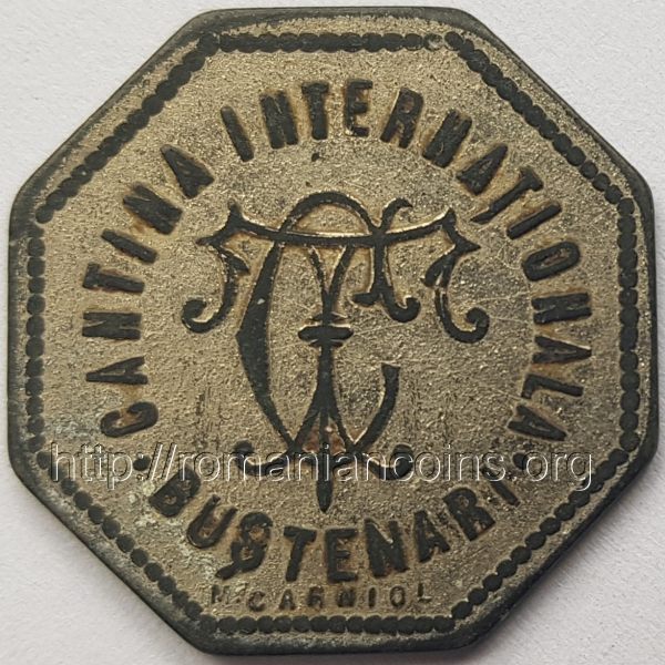octagon, width 20 mm, silvered zinc, 2.14 g face value 50, outer pearl octagon | outer pearl octagon, with 7 edges with pearls, on the eighth edge being written the name of the engraver, M. CARNIOL, circular inscription CANTINA INTERNAȚIONALA ✶ BUȘTENARI ✶ meaning INTERNATIONAL CANTEEN, in the middle monogram CT |