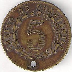 35 mm, ? g, brass denomination value 5 inside laurel and oak wreath, outer pearl circle, inscription CASINO DE CONSTANTZA | monogram HCS inside olive branches inscription CASINO DE CONSTANTZA, monogram CC, outer pearl circle; inside monogram a dog or maybe a lion, stamped; pierced - on the place of the hole should be a small rhombic adornment |