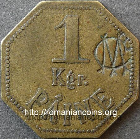 octagon, 24x24 mm, brass Obverse: denomination value "1 Kgr. PÂINE" meaning "1 kilogram of bread", outer pearl border, incuse MC monogram (standing for Magasinul de consum, Consumption store) |