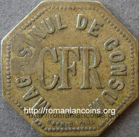 Reverse: inscription "MAGASINUL DE CONSUM CFR" meaning "CFR CONSUMPTION STORE", below the name of the engraver, CARNIOL FIUL meaning "CARNIOL SON", outer pearl border |