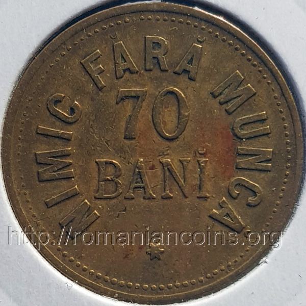 22 mm, 3.05 g, brass face value 10 BANI, outer pearl circle, face value 70 BANĬ, inscription NIMIC FĂRĂ MUNCĂ ✶ meaning NOTHING WITHOUT WORK |
