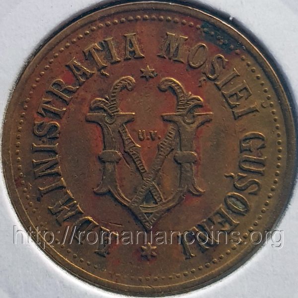 outer pearl circle, circular inscripion ADMINISTRAȚIA MOȘIEI GUȘOENI ✶ meaning GUȘOENI ESTATE ADMINISTRATION, in the middle monogram UV, inscription U.V., above the monogram ✶ |