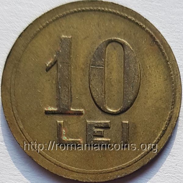 20 mm, 2.59 g, alamă cerc perlat exterior, valoarea nominală 10 LEI | cerc liniar exterior, CONSUMUL MUNCITORILOR DIN VALEA JIULUI ✽ PETROSANI ✽ |