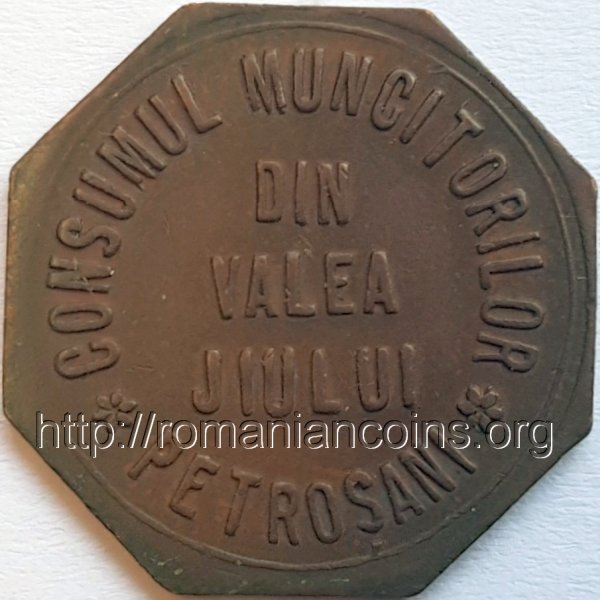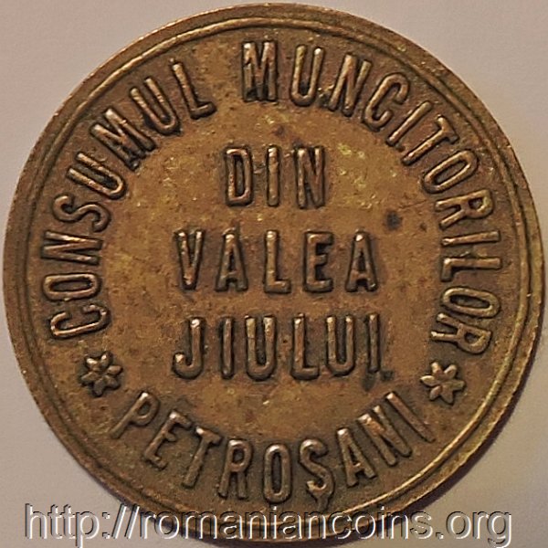 18.3 mm, 2 g, alamă cerc perlat exterior, valoarea nominală 1 LEU | cerc liniar exterior, inscripția CONSUMUL MUNCITORILOR DIN VALEA JIULUI ✽ PETROȘANI ✽ |