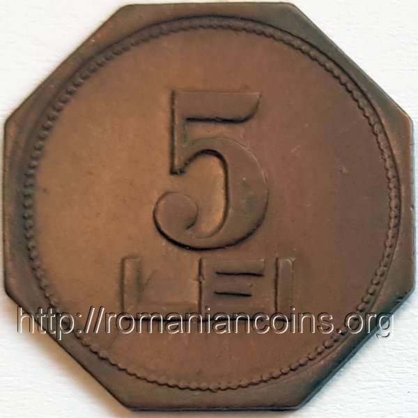 18.5 mm, ? g, alamă, octogonal cerc perlat exterior, valoarea nominală 5 LEI | cerc liniar exterior, CONSUMUL MUNCITORILOR DIN VALEA JIULUI ✽ PETROȘANI ✽ |
