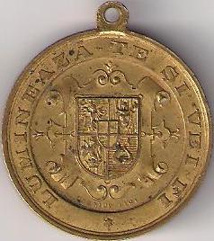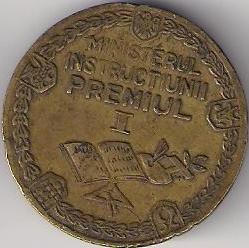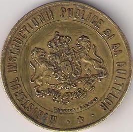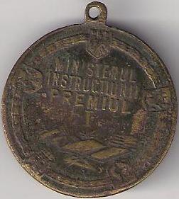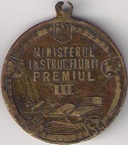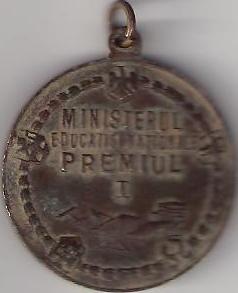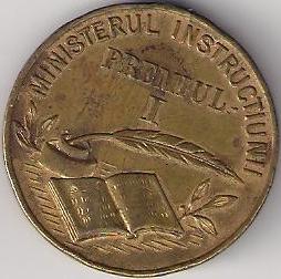 | ? mm, ? grame, metal galben inscripția MINISTERUL INSTRUCȚIUNII PREMIUL I, carte deschisă, călimară cu pană și două mlădițe | în cerc liniar interior chipul regelui Mihai copil, inscripția circulară MIHAI I REGE AL ROMANIEI • * • |