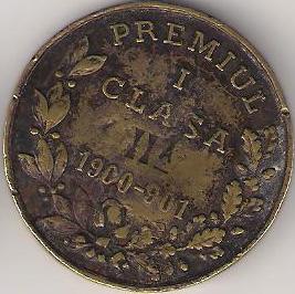 | ? mm, ? grame, metal galben cunună din ramuri de laur și de stejar, inscripția PREMIUL I CLASA IIA 1900-901 (numărul clasei adăugat ulterior, incus) | în cerc liniar interior stema mijlocie a României, sub stemă CARNIOL - RADIVON, inscripția circulară MINISTERUL INSTRUCȚIUNEI PUBLICE ȘI CULTE * |