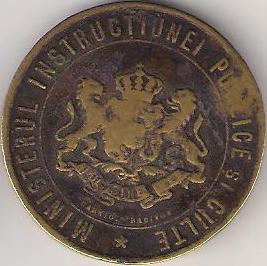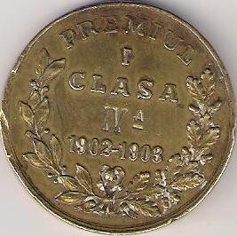 | 34 mm, ? grame, metal galben cunună din ramuri de laur și de stejar, inscripția PREMIUL I CLASA IVA 1902-1903 (numărul clasei adăugat ulterior, incus) | în cerc liniar interior stema mijlocie a României, sub stemă RADIVON - CARNIOL, inscripția circulară MINISTERUL INSTRUCȚIUNII PUBLICE ȘI AL CULTELOR • * • |