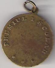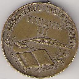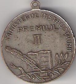 | ? mm, ? grame, metal galben, toartă (ruptă) inscripția MINISTERUL INSTRUCȚIUNII PREMIUL II, carte deschisă, călimară cu pană și două mlădițe | în cerc liniar interior chipul regelui Mihai copil, inscripția circulară MIHAI I REGE AL ROMANIEI • * • |