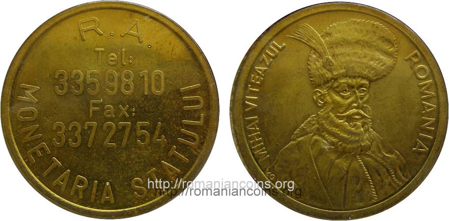 29 mm, alamă inscripția R.A. MONETARIA STATULUI, în centru Tel: 3359810 Fax: 3372754 | ROMANIA, MIHAI VITEAZUL și bustul domnitorului; pe umărul drept sînt inițialele lui Vasile Gabor, gravorul piesei |