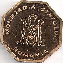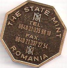 octogon cu latura de 27 mm, tombac? inscripția MONETARIA STATULUI ROMANIA, în centru sigla MS | inscripția circulară în limba engleză THE STATE MINT ROMANIA, în cîmp o siglă MS, TEL. 0040 21 335 98 10 FAX. 0040 21 337 27 54, încă o siglă MS |