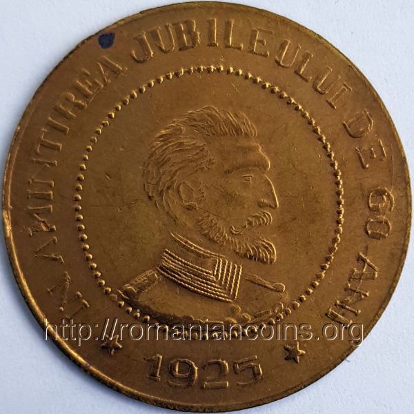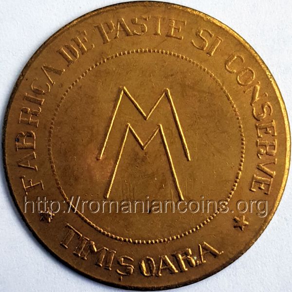 27 mm, 2.94 g, alamă inscripția FABRICA DE PASTE ȘI CONSERVE ★ TIMIȘOARA ★, în cerc perlat interior două litere M | inscripția IN AMINTIREA JUBILEULUI DE 60 ANI ★ 1925 ★, în cerc perlat interior bustul regelui Ferdinand I |