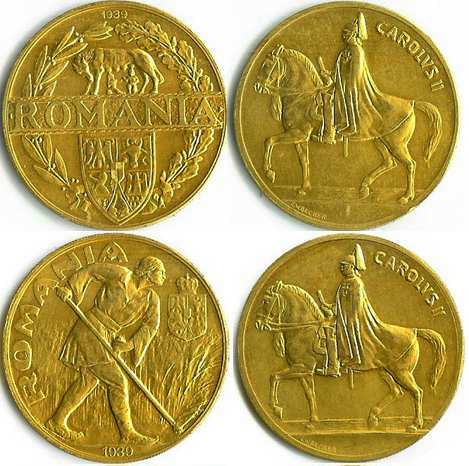 41 mm diameter, 42 g, gold 90%, copper 10%, grained edge along the edge ROMANIA, Romanian coat of arms, a peasant mowing, tall grass in the background. At bottom year 1939. | along the edge inscription CAROLVS II, in the middle the king on horseback, to the left. In exergue, along the edge, at the bottom left, the name of the engraver, E.W.BECKER. |