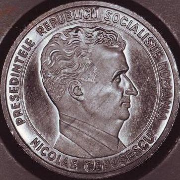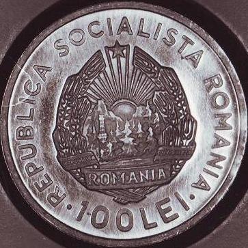 27 mm diameter, 12.19 g, silver effigy of Ceaušescu to the right, inscription "PREŠEDINTELE REPUBLICII SOCIALISTE ROMANIA NICOLAE CEAUŠESCU" meaning "PRESIDENT OF THE SOCIALIST REPUBLIC OF ROMANIA" | face value "100 LEI", inscription "· REPUBLICA SOCIALISTA ROMANIA ·" meaning "SOCIALIST REPUBLIC OF ROMANIA", Romanian coat of arms |