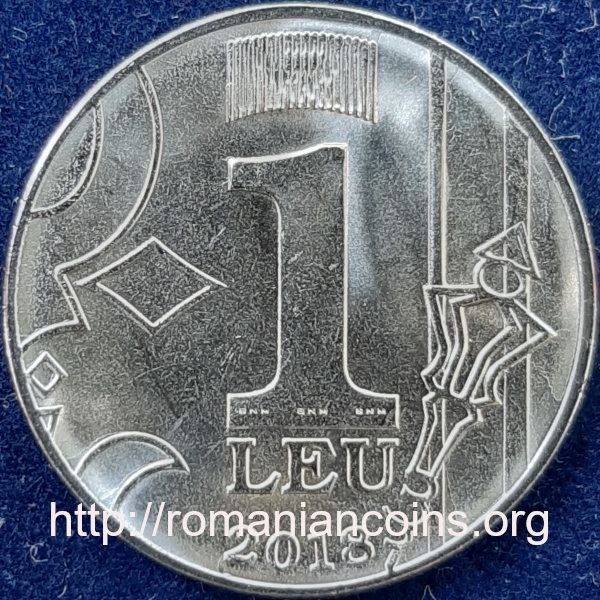 face value 1 LEU, micro-engraved inscription BNM (National Bank of Moldavia) written three times on the base of the digit, year 2018, on background a fragment of the coat of arms of the Republic of Moldova; above a rectagle made of vertical segments on which monogram R M (from Republic of Moldova) is written as a hidden image; the letters are visible by tilting the coin from left to right about the vertical axis