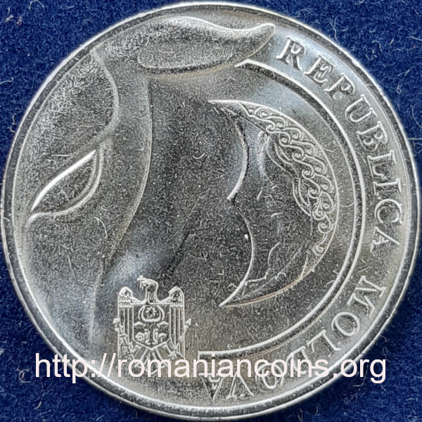 | Moldavian coat of arms and inscription REPUBLICA MOLDOVA meaning "REPUBLIC OF MOLDOVA", at right a crescent having the face of a woman, at left a portion of an auroch head (a fragment of the coat of arms of the medieval Moldavia, with an auroch head as its main element)