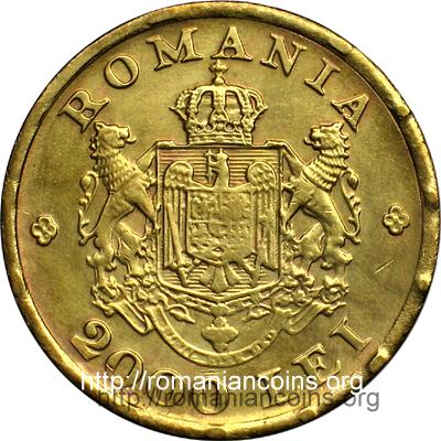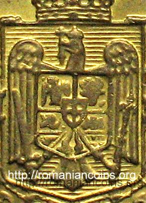 24 mm diameter, 5.1 g, copper 63%, zinc 37%, flat edge Incuse on the edge: NIHIL SINE DEO denomination "2000 LEI", ROMANIA and Romanian coat of arms, at left and at right a flower-shaped cross. | the inscription "MIHAI I REGELE ROMANILOR" meaning "KING OF THE ROMANIANS", MIHAI I head facing right and year 1946 between two square signs. Under the neck lies H. IONESCU, the engraver's name. Mintage: 24.619.000 coins |